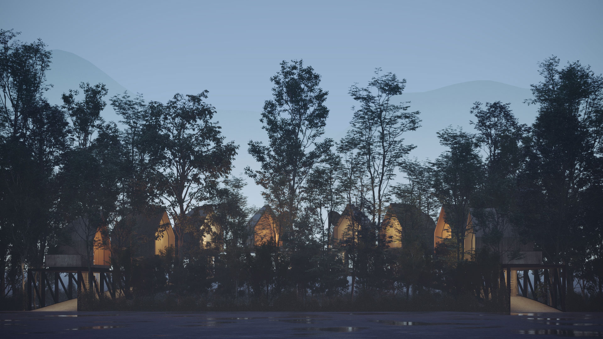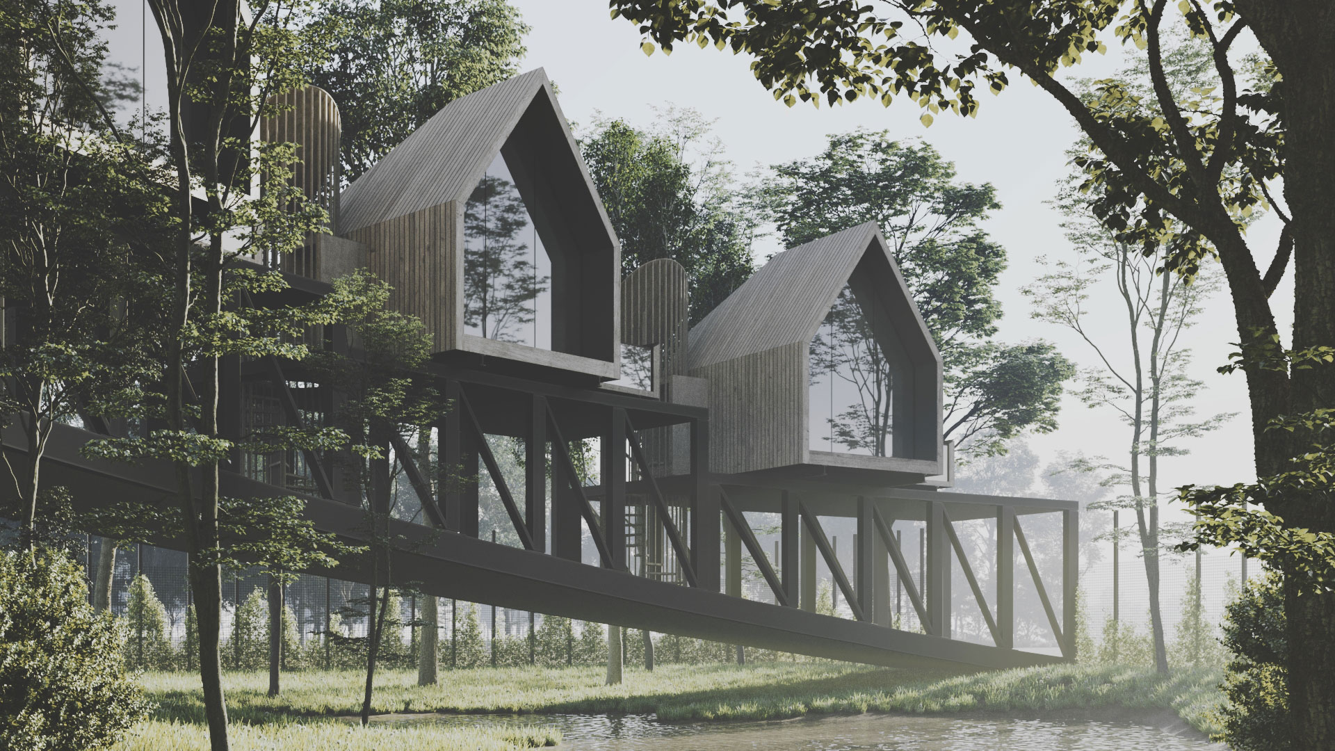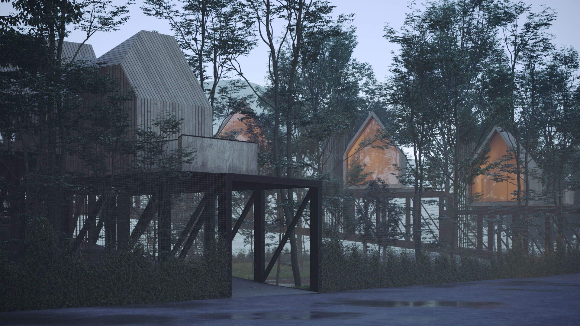 The Ramsar complex is the result of overlapping the diagram of a bridge and a hut, reminiscent of a historical desire to reside above the forest trees. This aspiration needs to be reconsidered today under different circumstances. How could we suspend seven huts above the forest in a way that they have no contact with the ground? How could we ensure public access to the forest for individuals who do not rent the cabins?