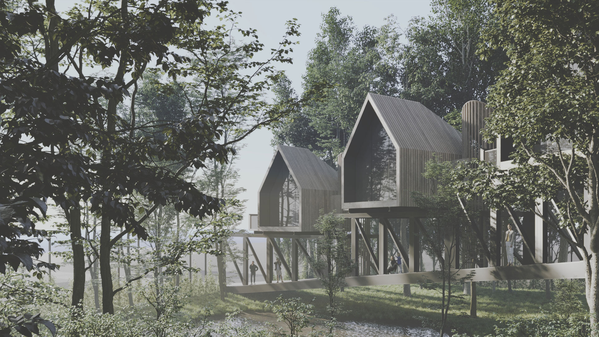 The Ramsar complex is the result of overlapping the diagram of a bridge and a hut, reminiscent of a historical desire to reside above the forest trees. This aspiration needs to be reconsidered today under different circumstances. How could we suspend seven huts above the forest in a way that they have no contact with the ground? How could we ensure public access to the forest for individuals who do not rent the cabins?
